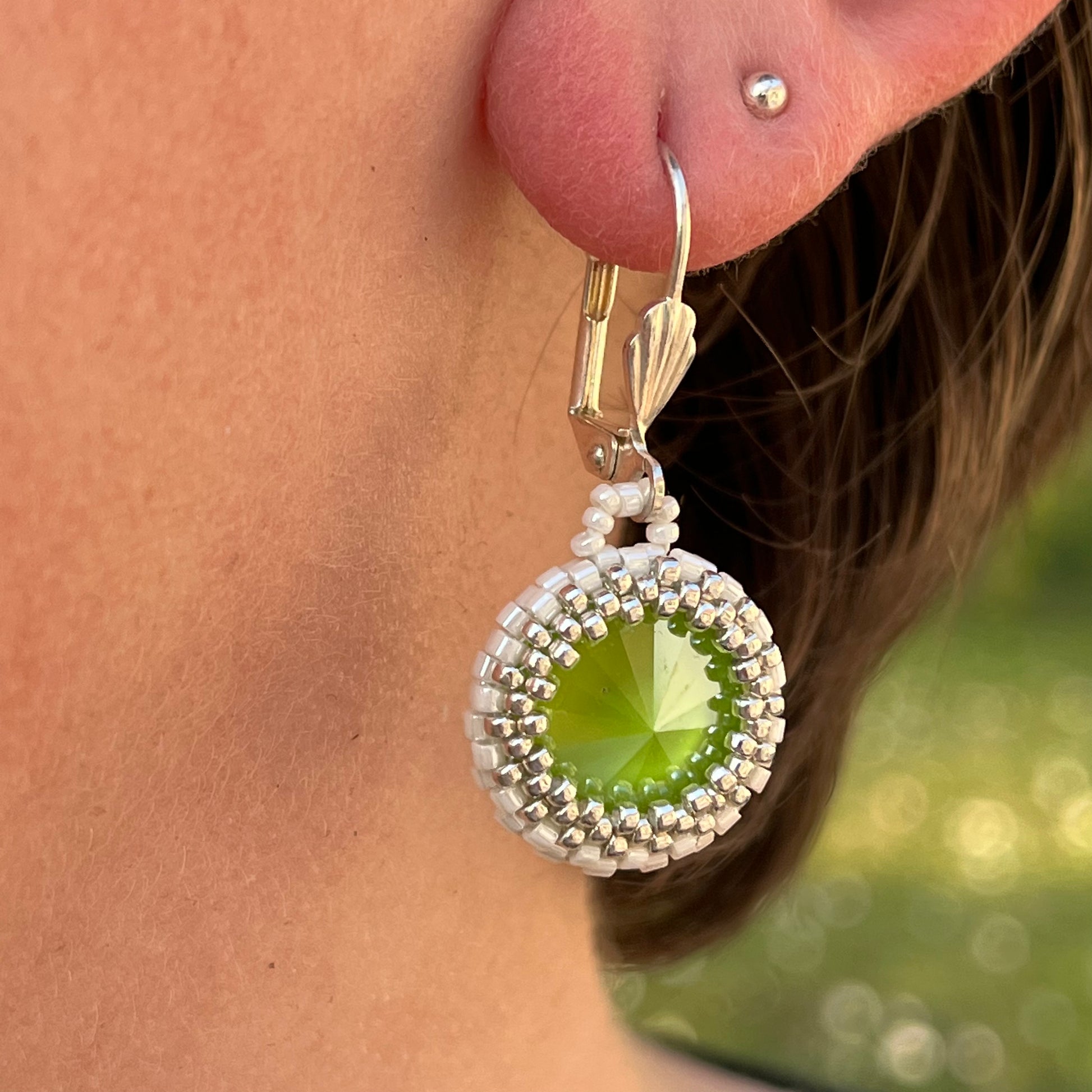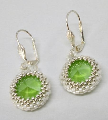 Ces magnifiques boucles d'oreilles faites main sont composées de perles Miyuki de 1mm minutieusement tissées à l'aiguille, autour d'un cabochon en PureCrystal Swarovski de 1,4 cm.