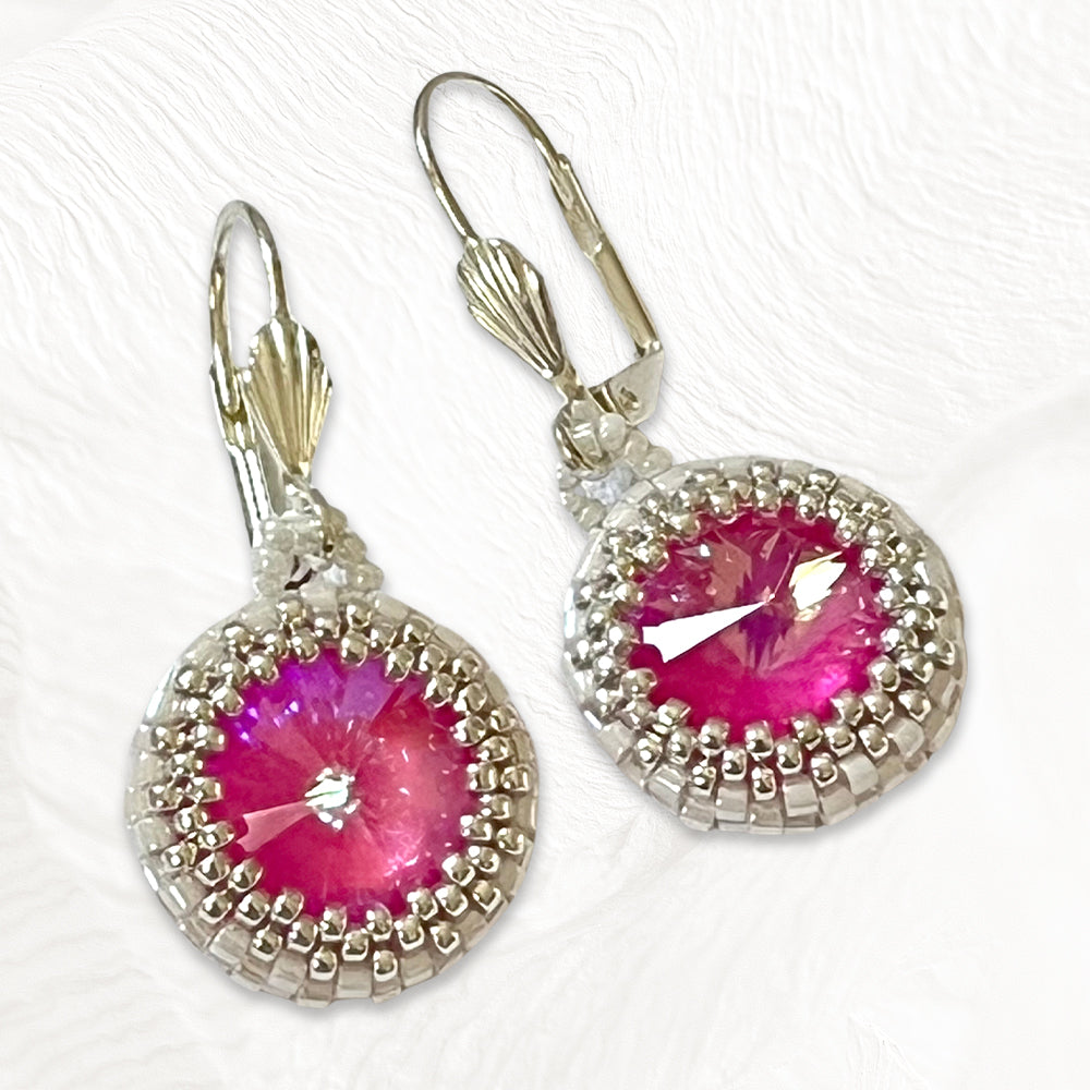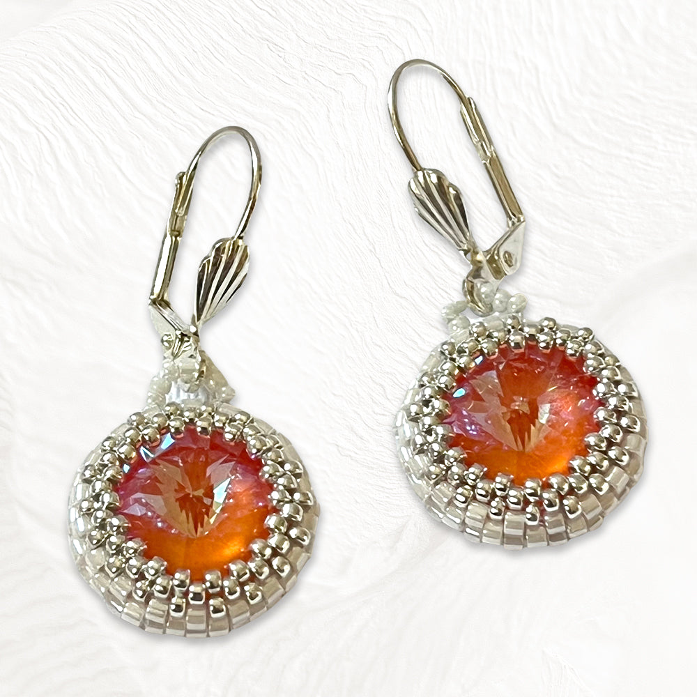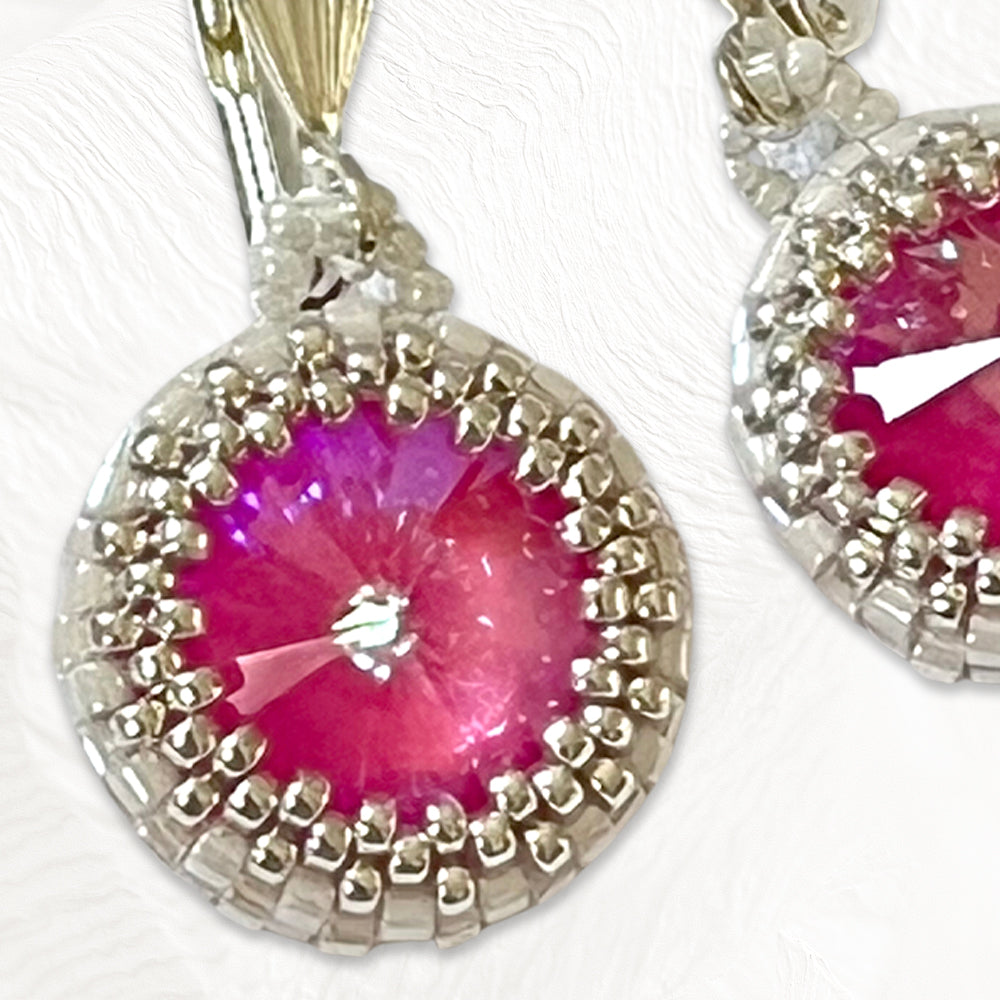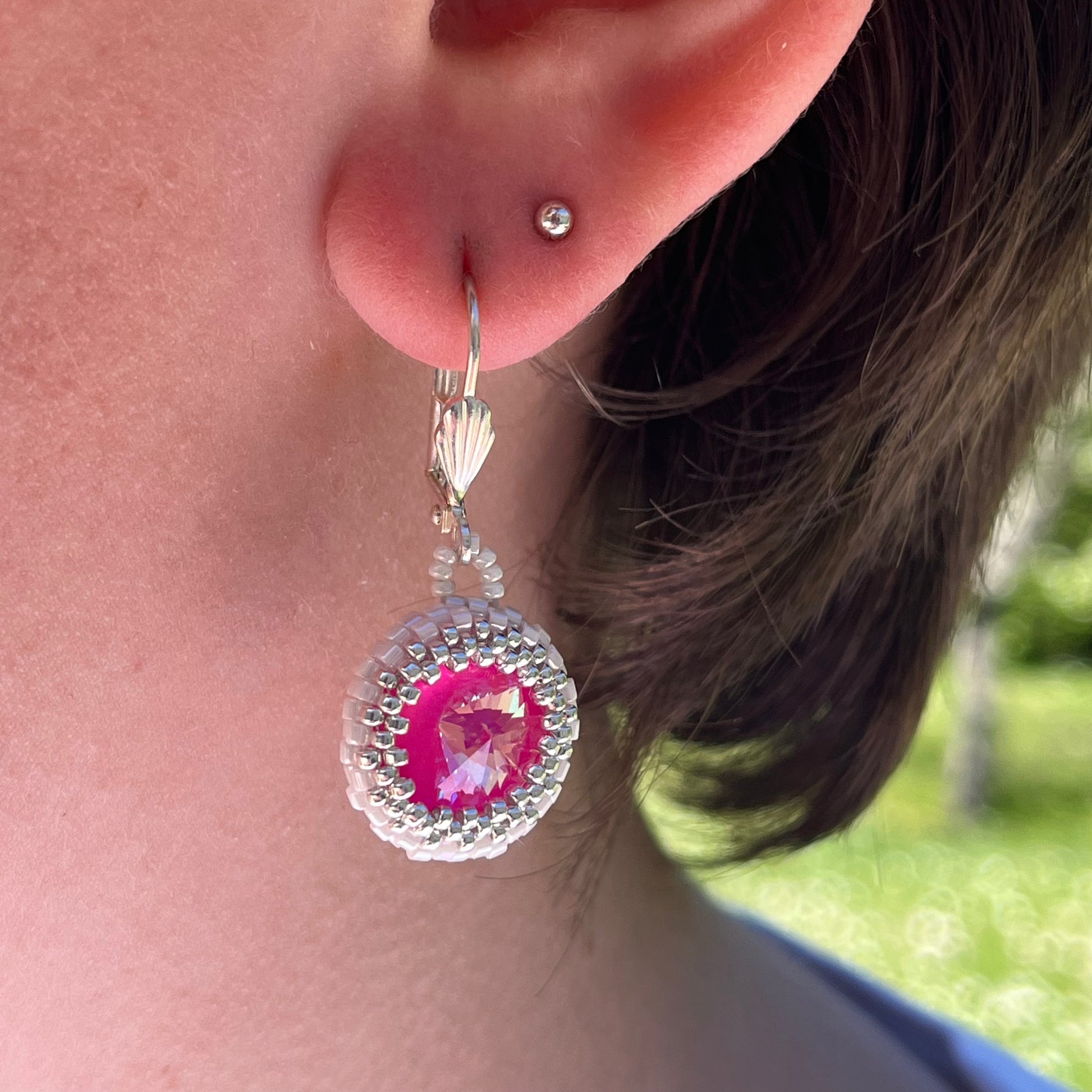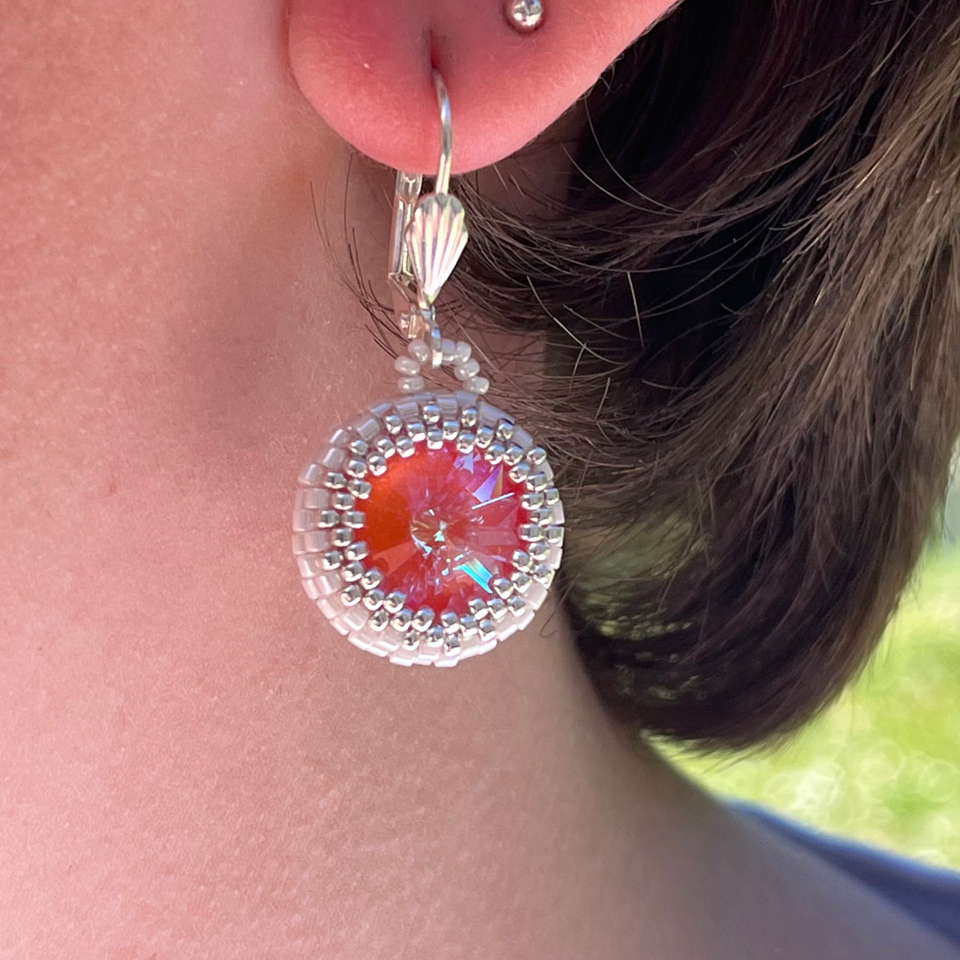 Ces magnifiques boucles d'oreilles faites main sont composées de perles Miyuki de 1mm minutieusement tissées à l'aiguille, autour d'un cabochon en PureCrystal Swarovski de 1,4 cm.